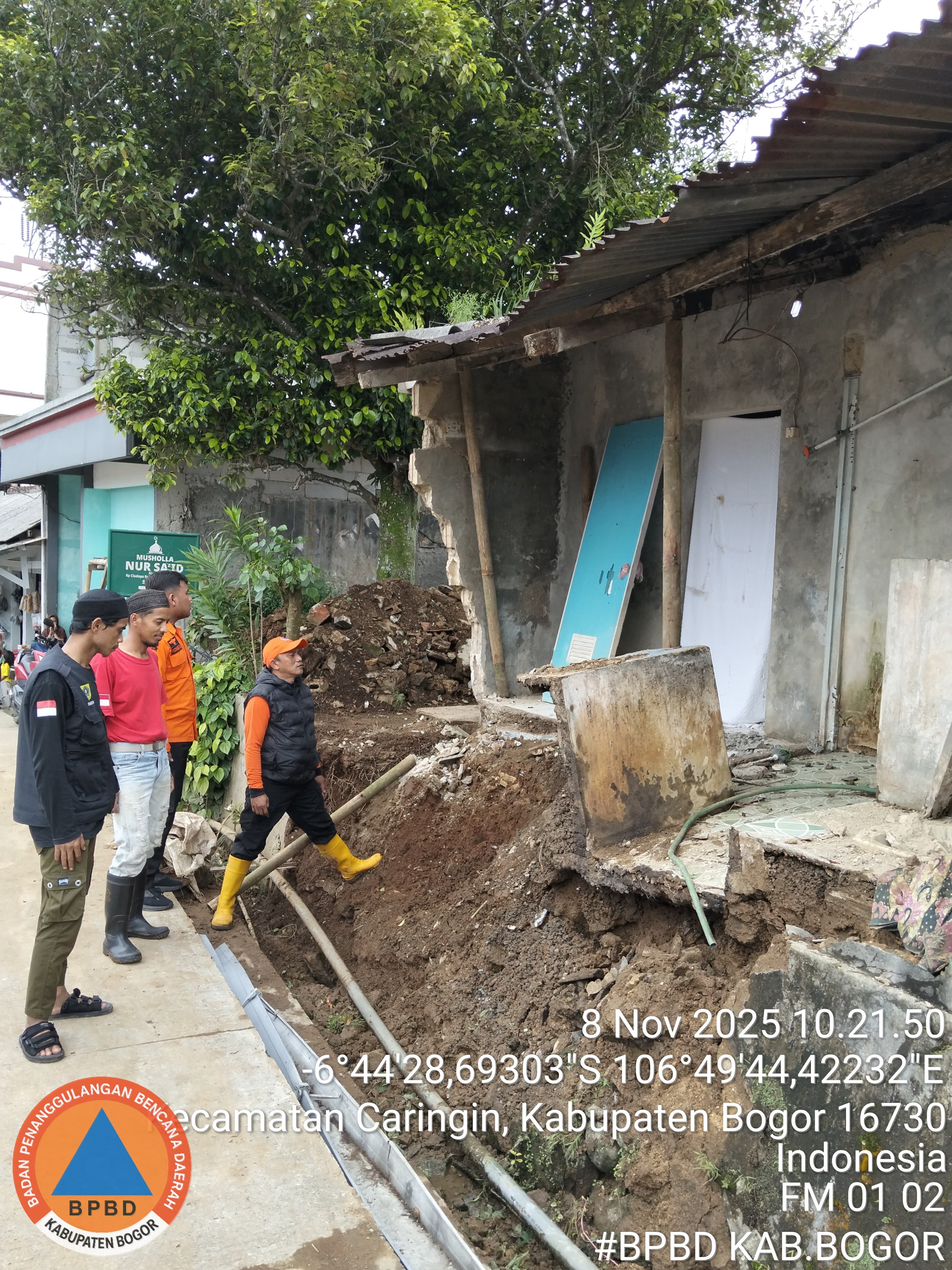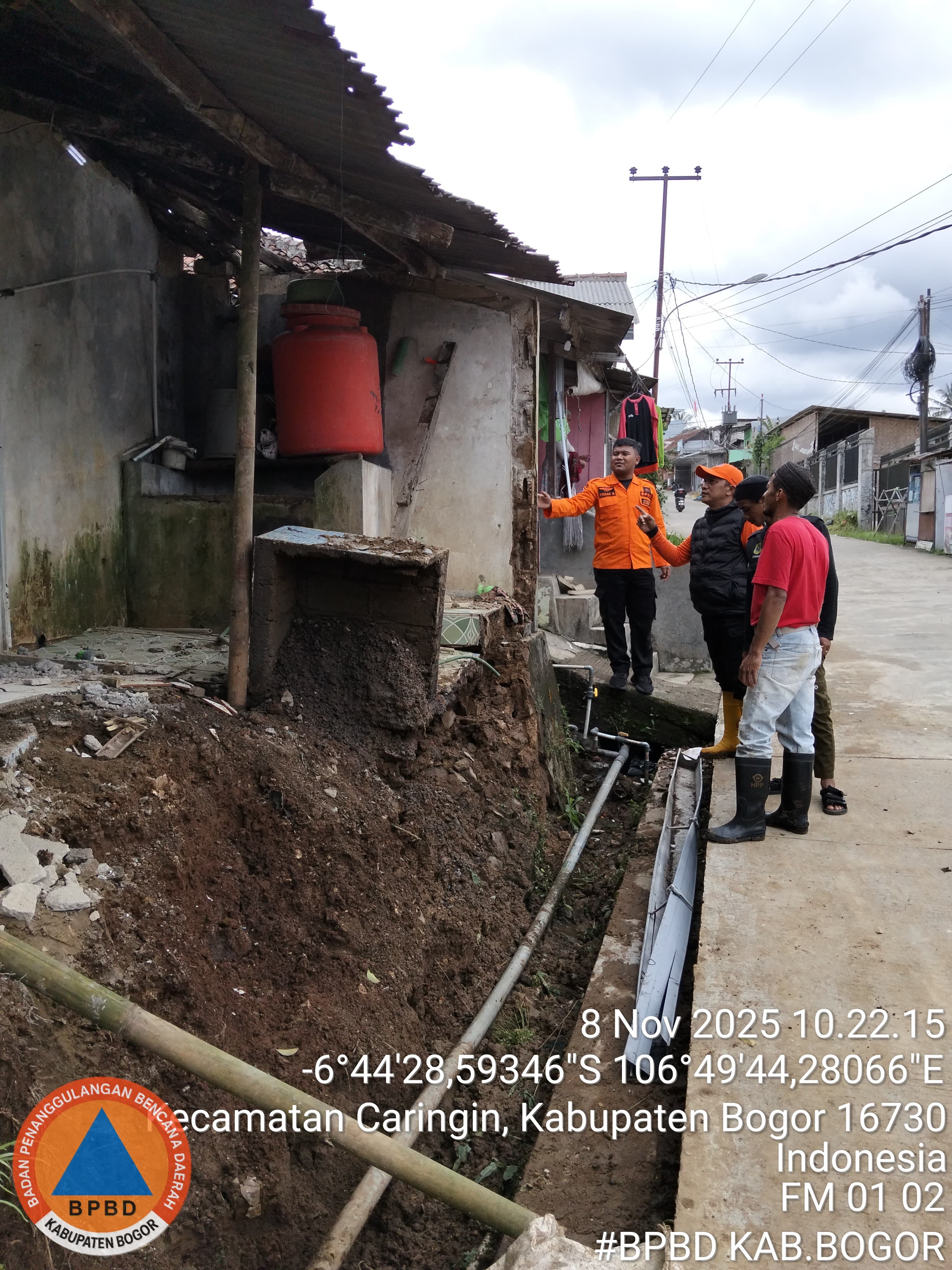 Kronologi dan Keterangan Kerusakan : Disebabkan hujan deras yang terjadi pada Jum'at 07 November 2025 sore hari selama ± 2 jam ditambah kontur tanah yang labil serta aliran drainase air hujan yang kurang lancar sehingga mengakibatkan TPT pondasi rumah mengalami longsor dan berdampak kerusakan pada satu unit rumah dengan ukuran longsoran Panjang ± 5 meter, Tinggi ± 1,5 meter, Lebar ± 1 meter
